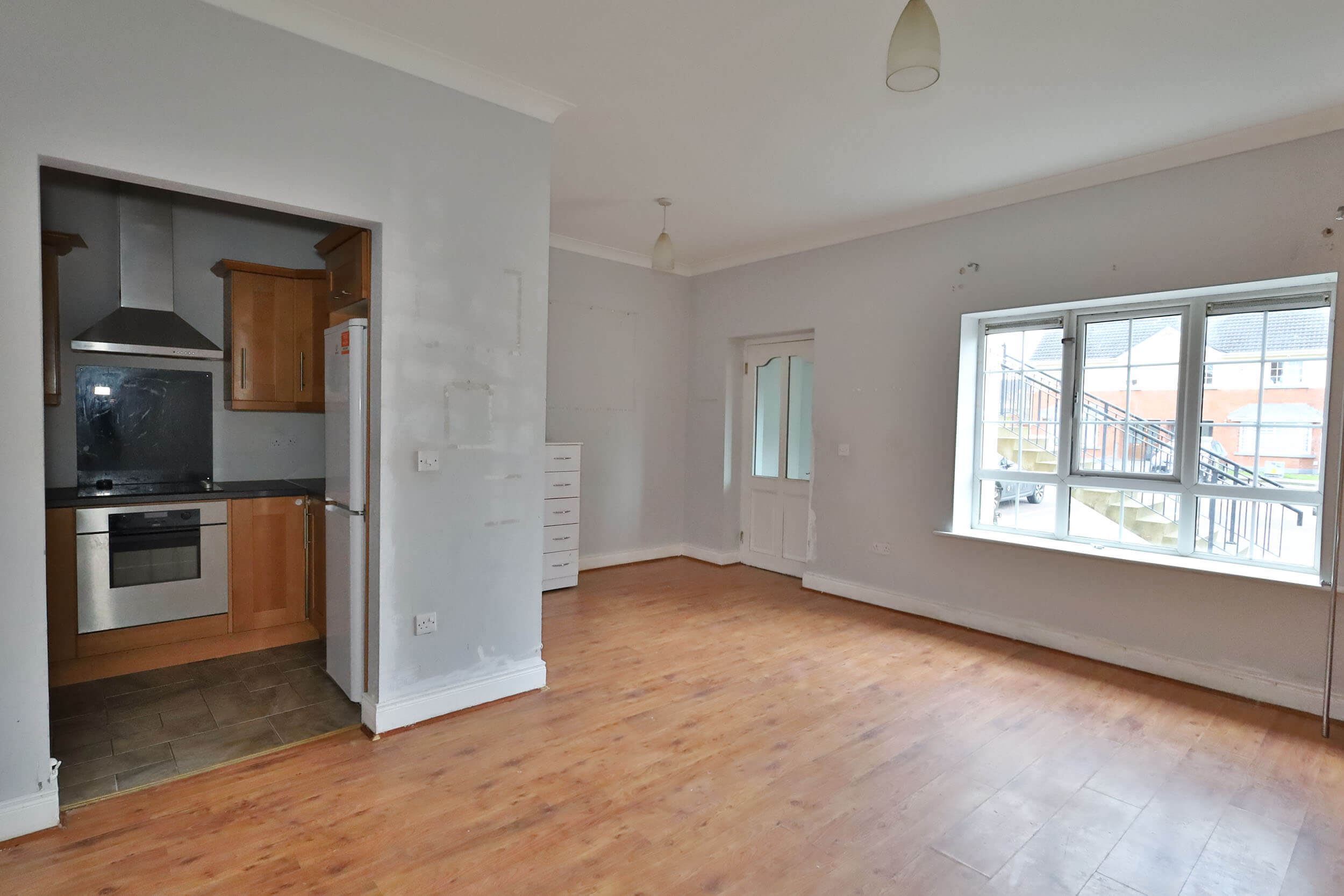 Inside the entrance hall leading into a spacious and light filled lounge. The adjoining kitchen is functional and well laid out. The apartment also includes two generously sized bedrooms and large main bathroom, providing comfortable living throughout. The property would benefit from some light cosmetic updating, offering an excellent opportunity to add your own touch.