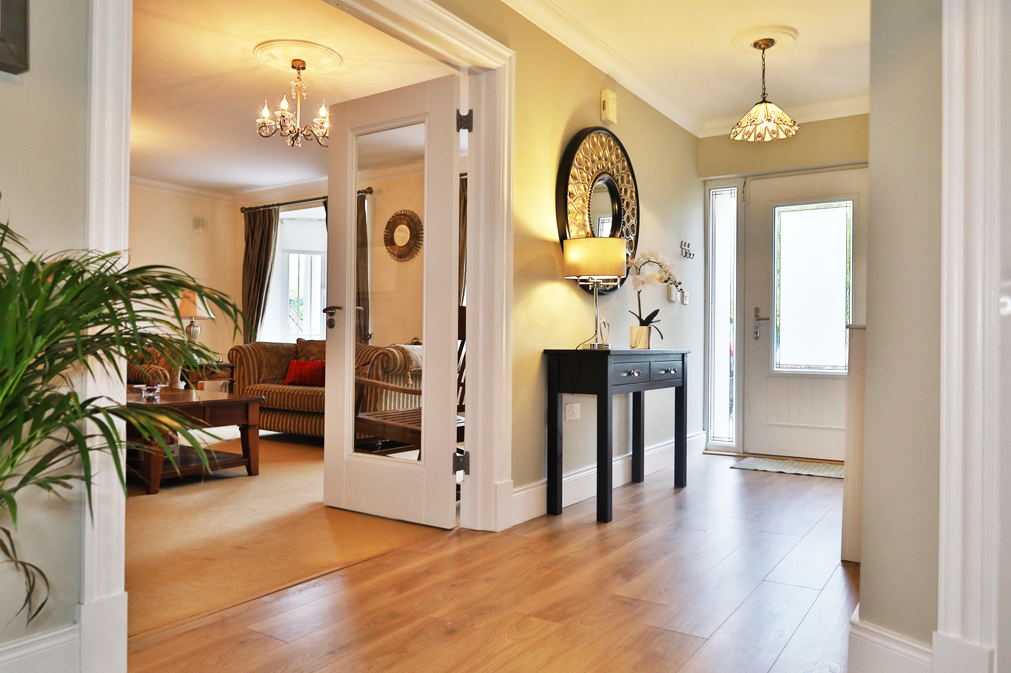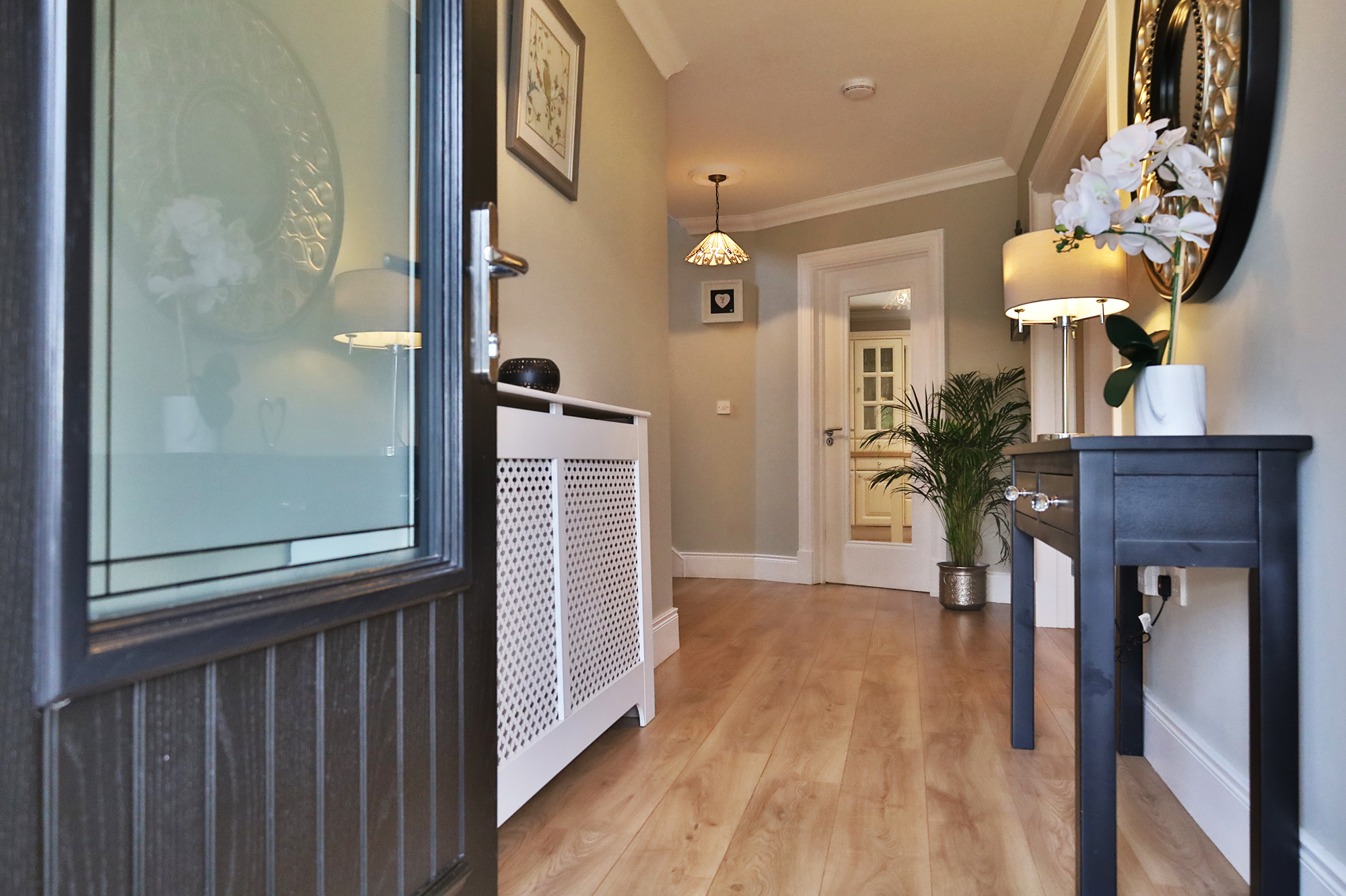 From the moment you arrive, this home makes a striking impression. The property is accessed through red brick entrance piers leading onto a large cobblelock driveway that provides ample off-street parking. The façade features an attractive mix of red brick and pebble-dash render, complemented by elegant white-framed bay and casement windows, creating a refined yet welcoming appearance.