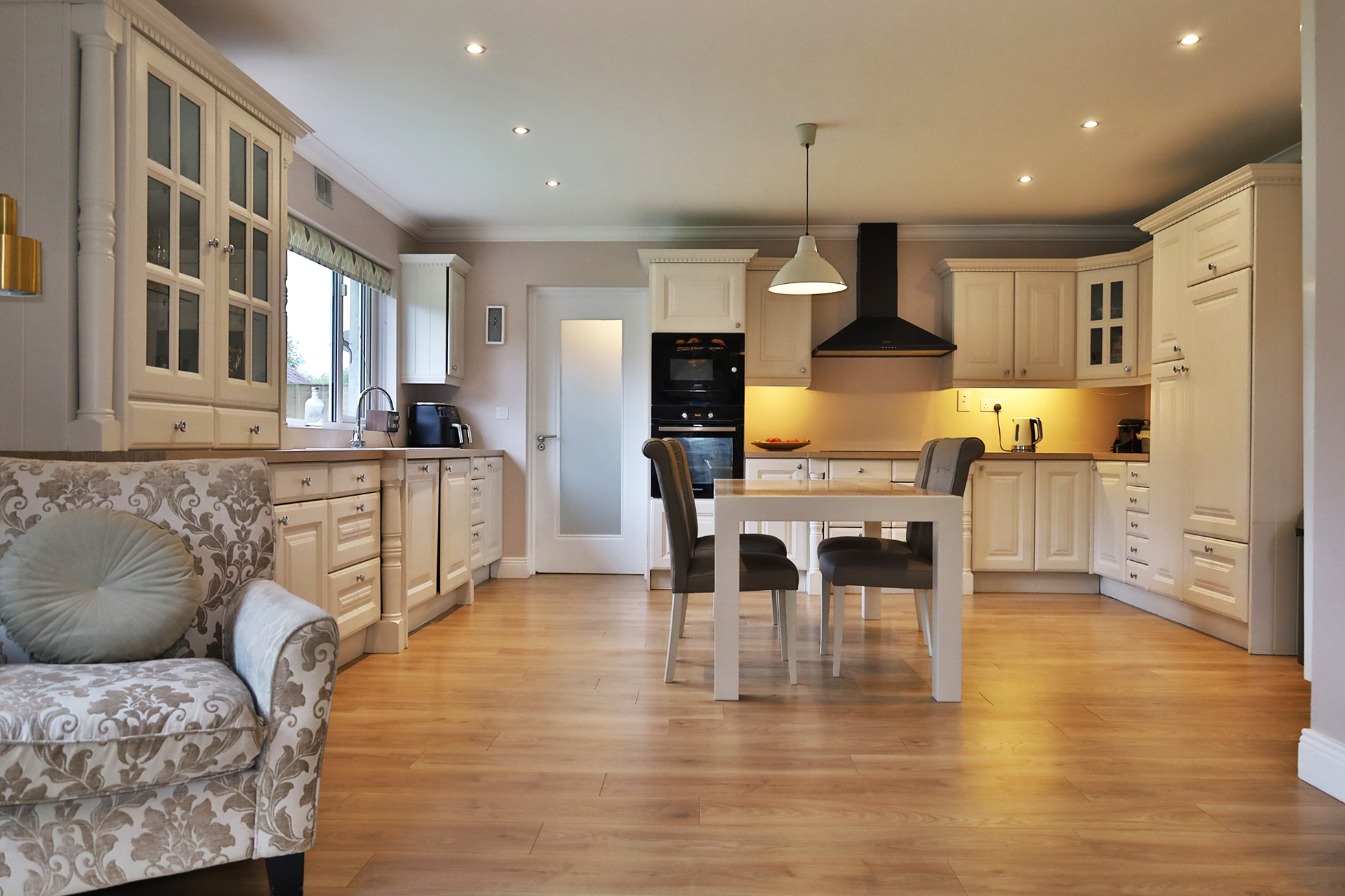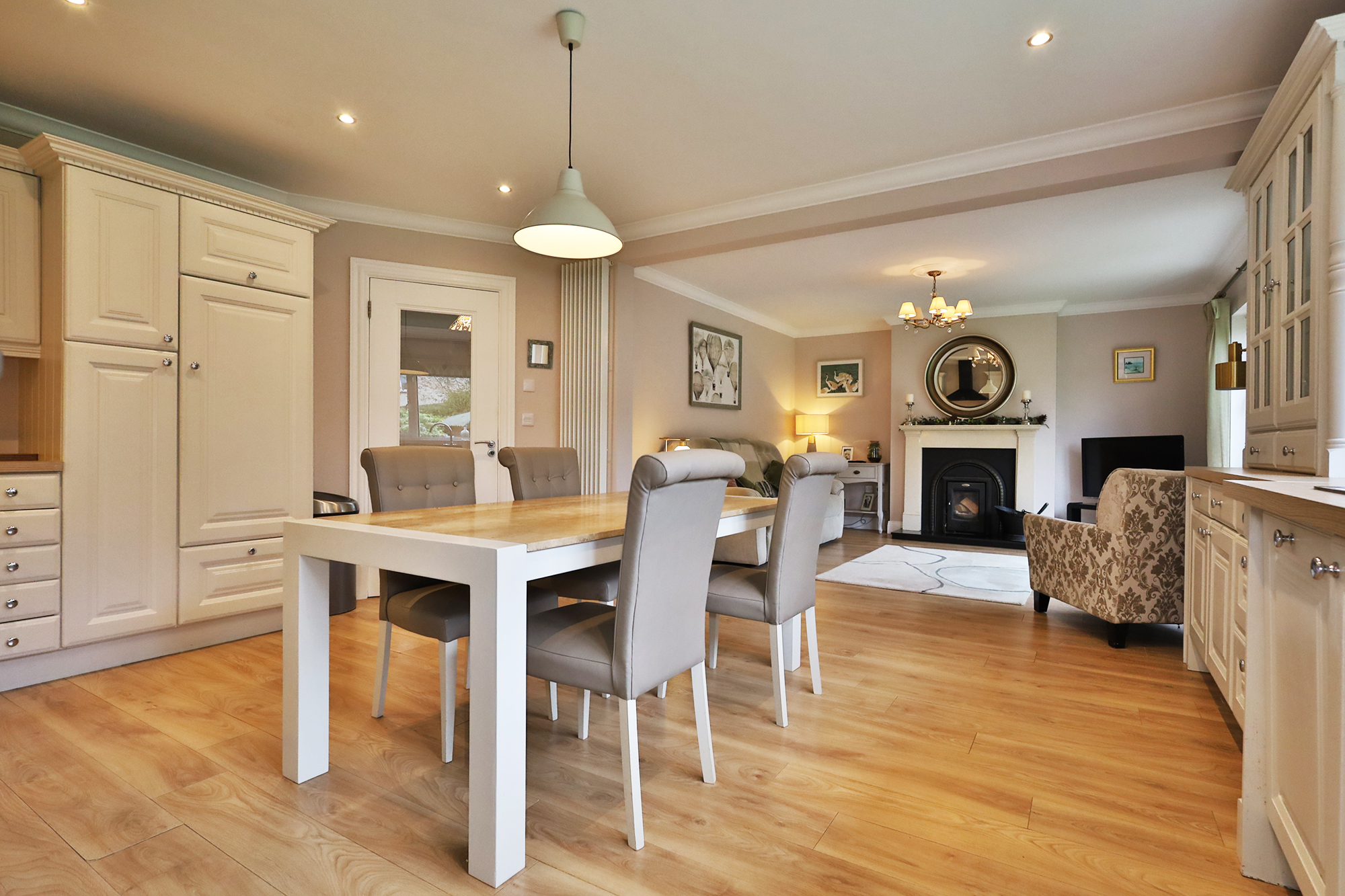 At the heart of the home is an expansive open-plan kitchen, dining, and living area, perfectly suited to modern family life. The kitchen is finished with classic cream cabinetry, glass display units, integrated appliances, and sleek countertops. A central dining space creates a relaxed setting for family