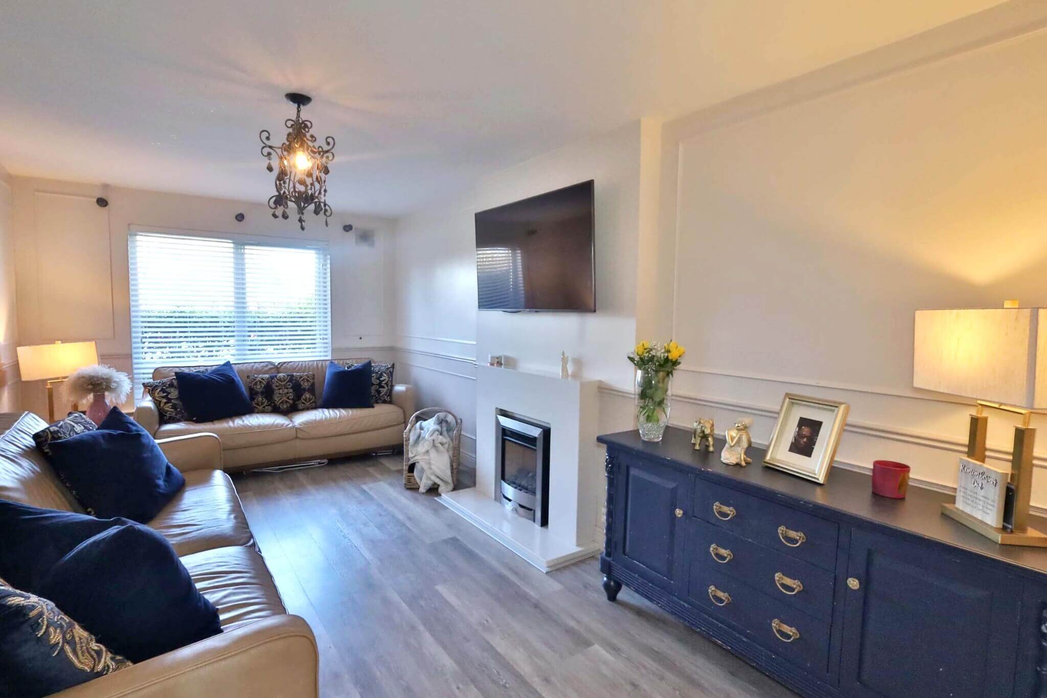 The lounge is enhanced by a feature marble fireplace with electric insert. To the rear, the home opens into a large open-plan kitchen and dining area, ideal for modern living. This bright and airy space features patio doors that flood the room with natural light and provide seamless access to the garden.