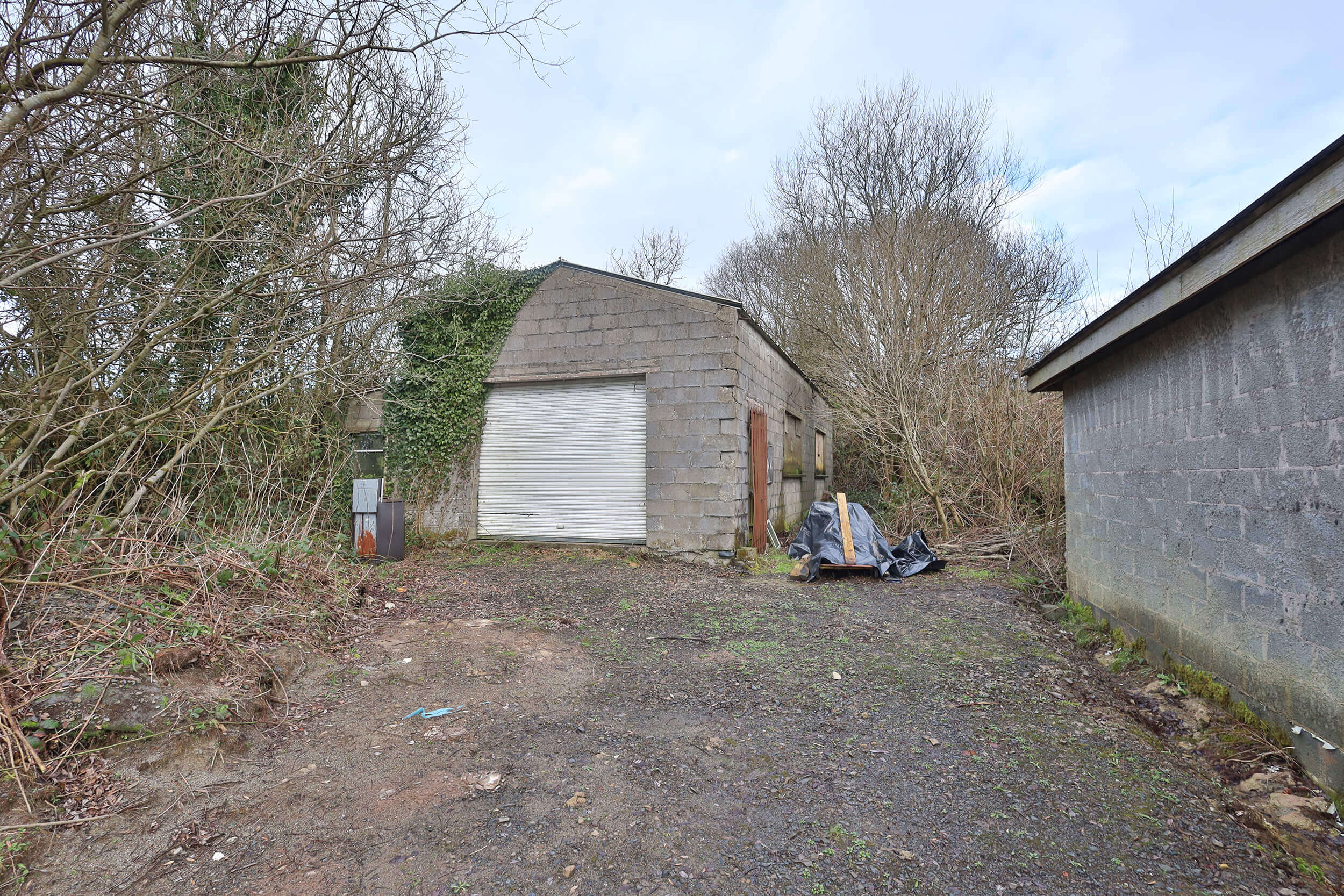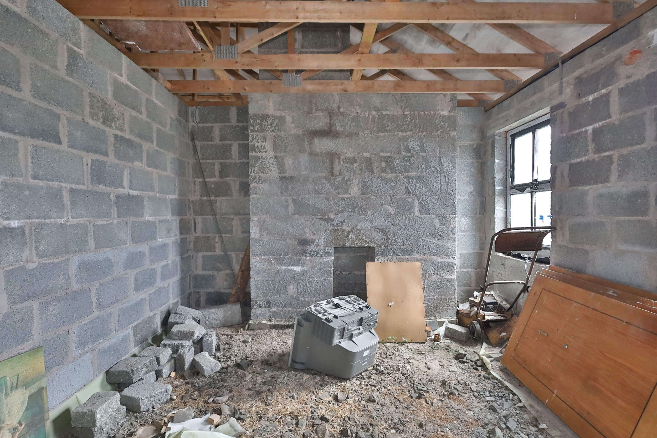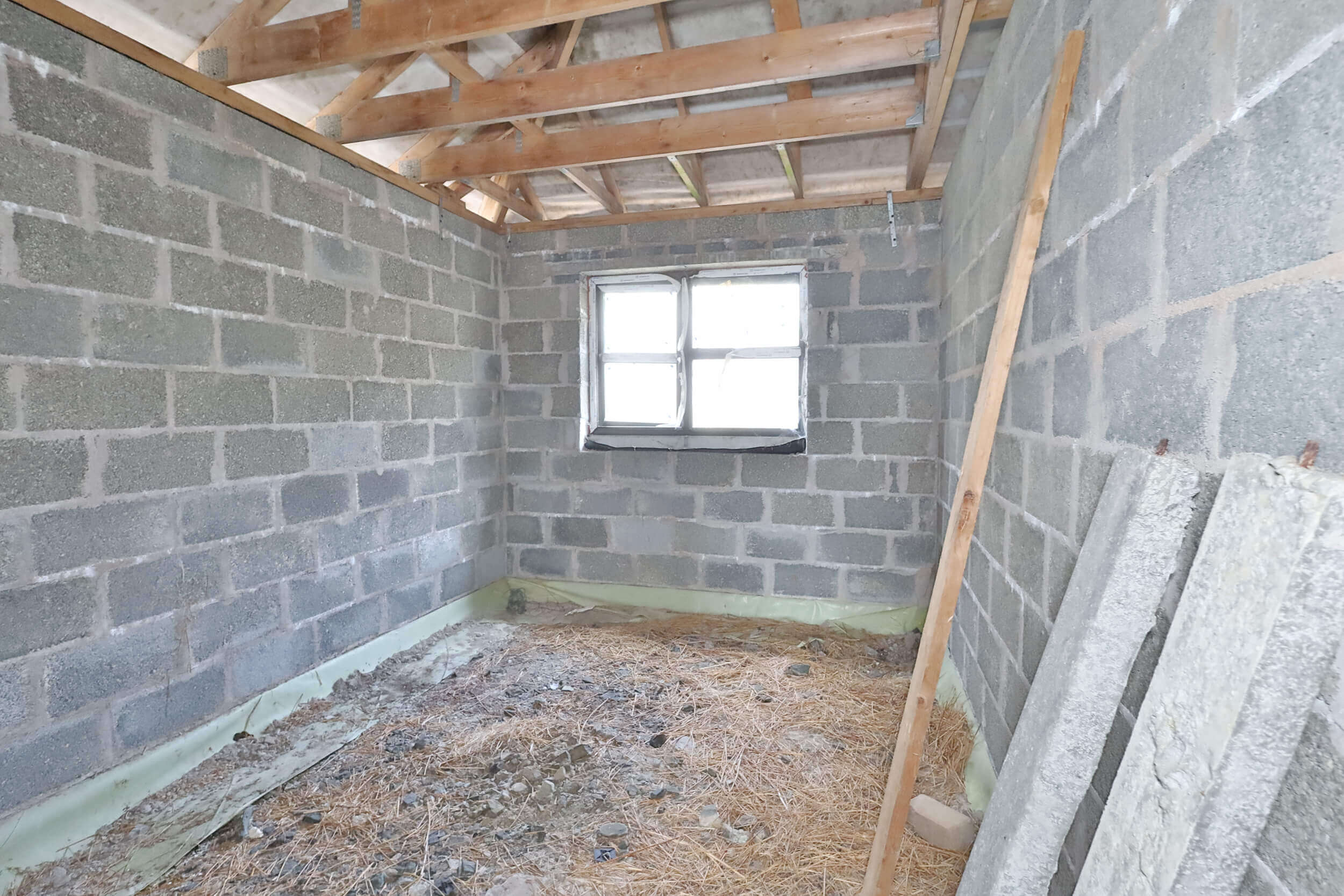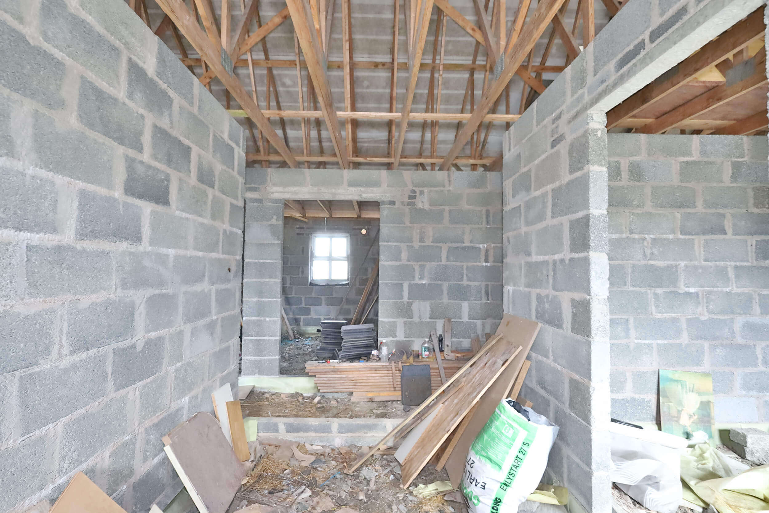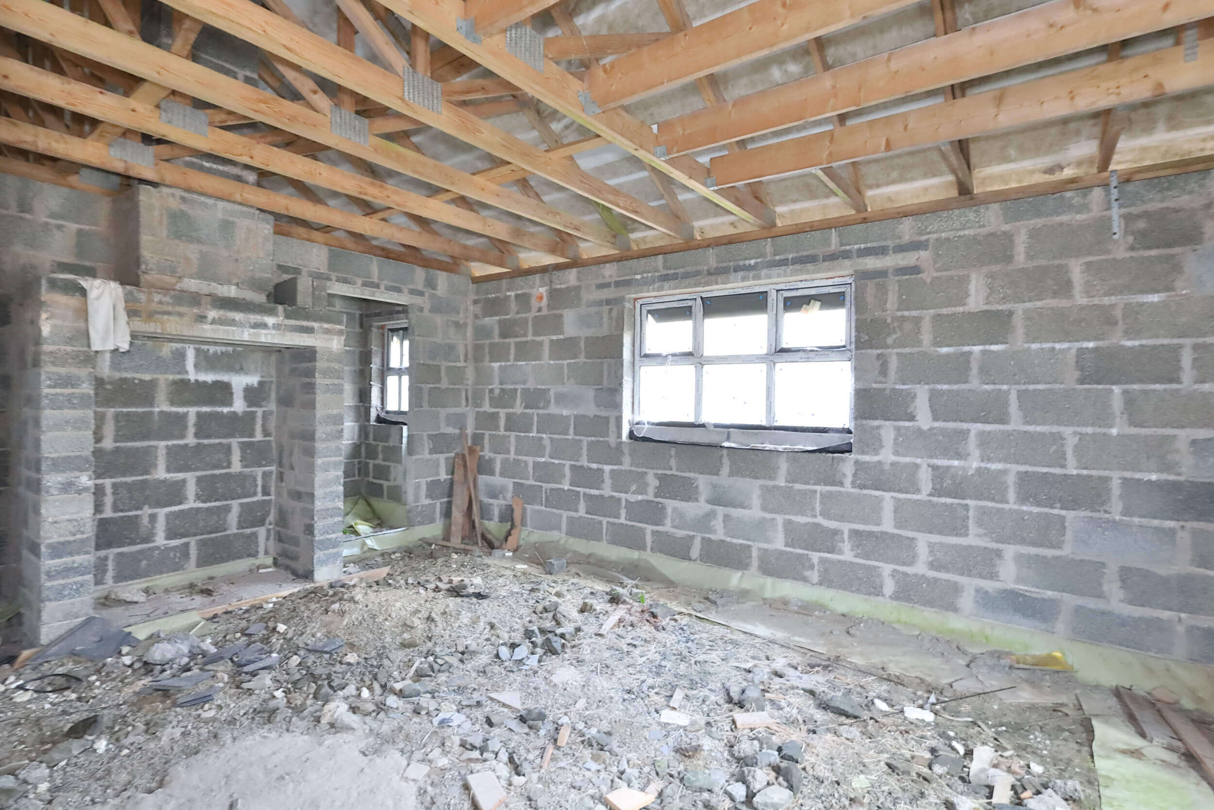 Internally, the dwelling is in open structural condition with internal divisions partially formed. This layout allows flexibility for reconfiguration if desired. Timber roof trusses are fitted, and the property provides a strong base for completion works. This type of project is ideal for builders, investors, or self-build purchasers seeking to create a bespoke home.