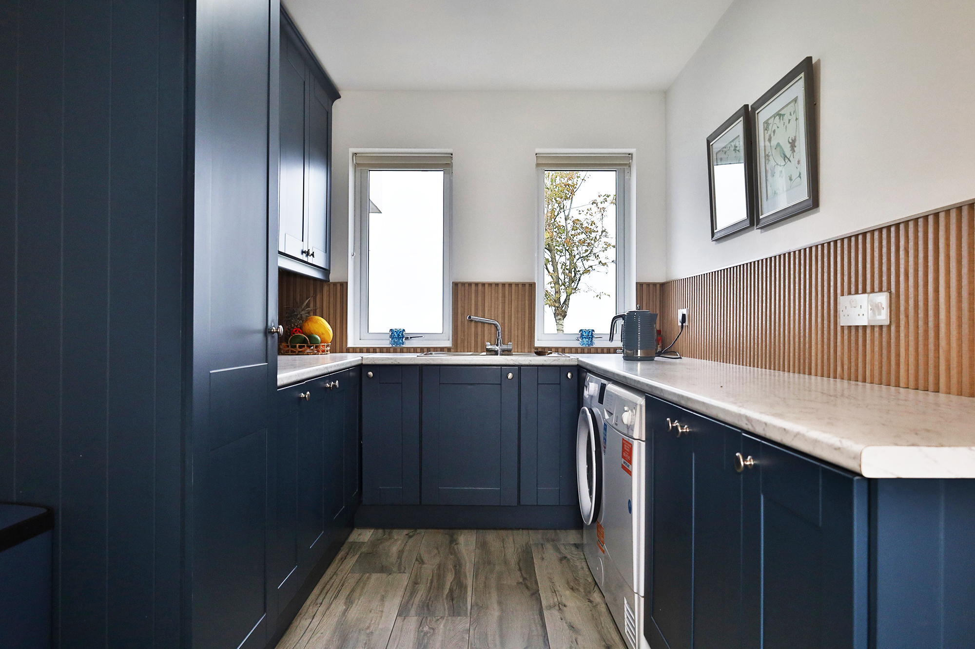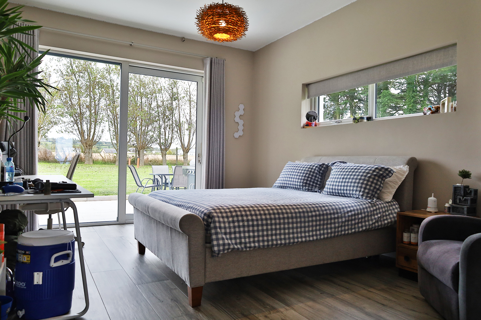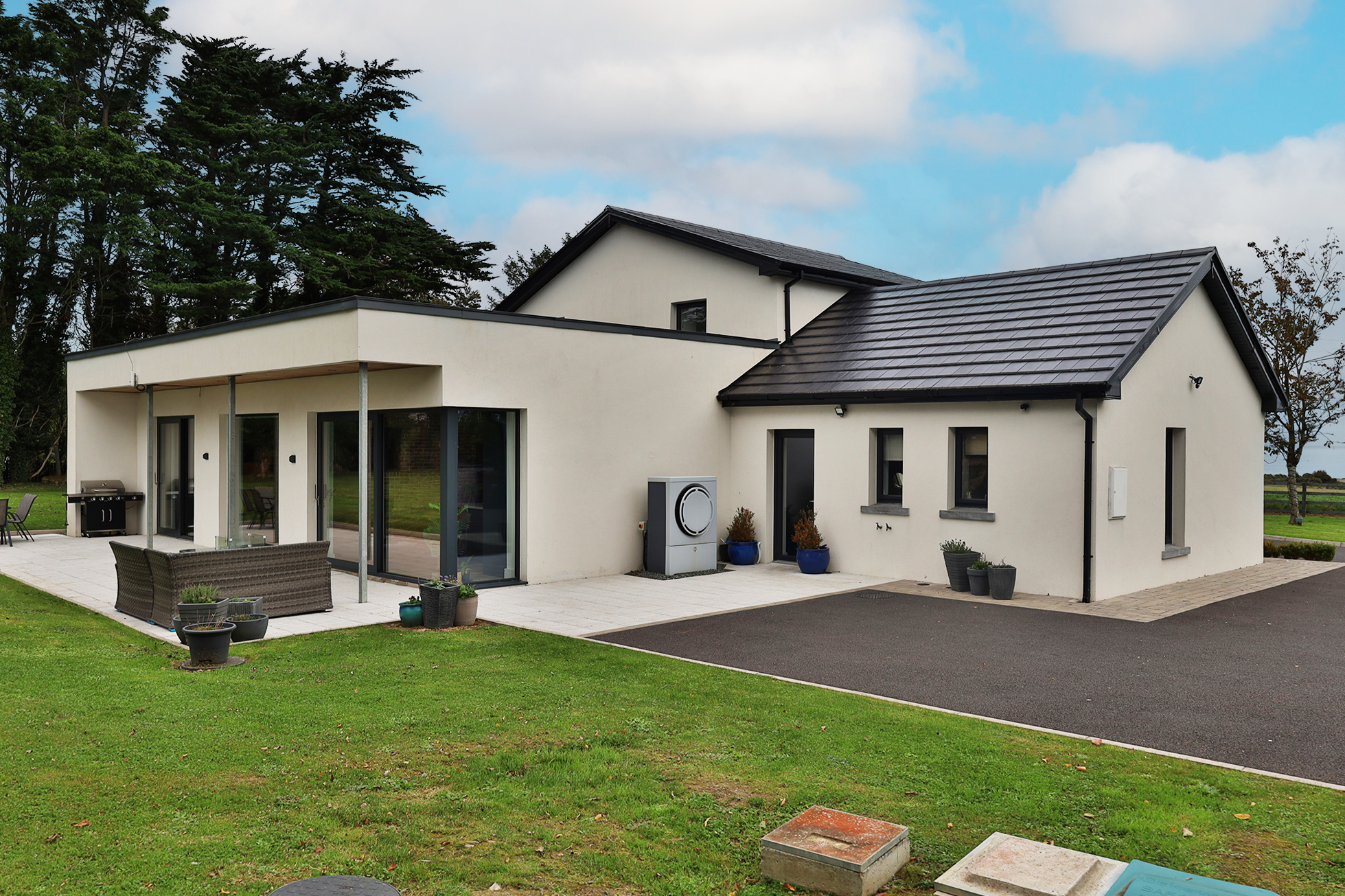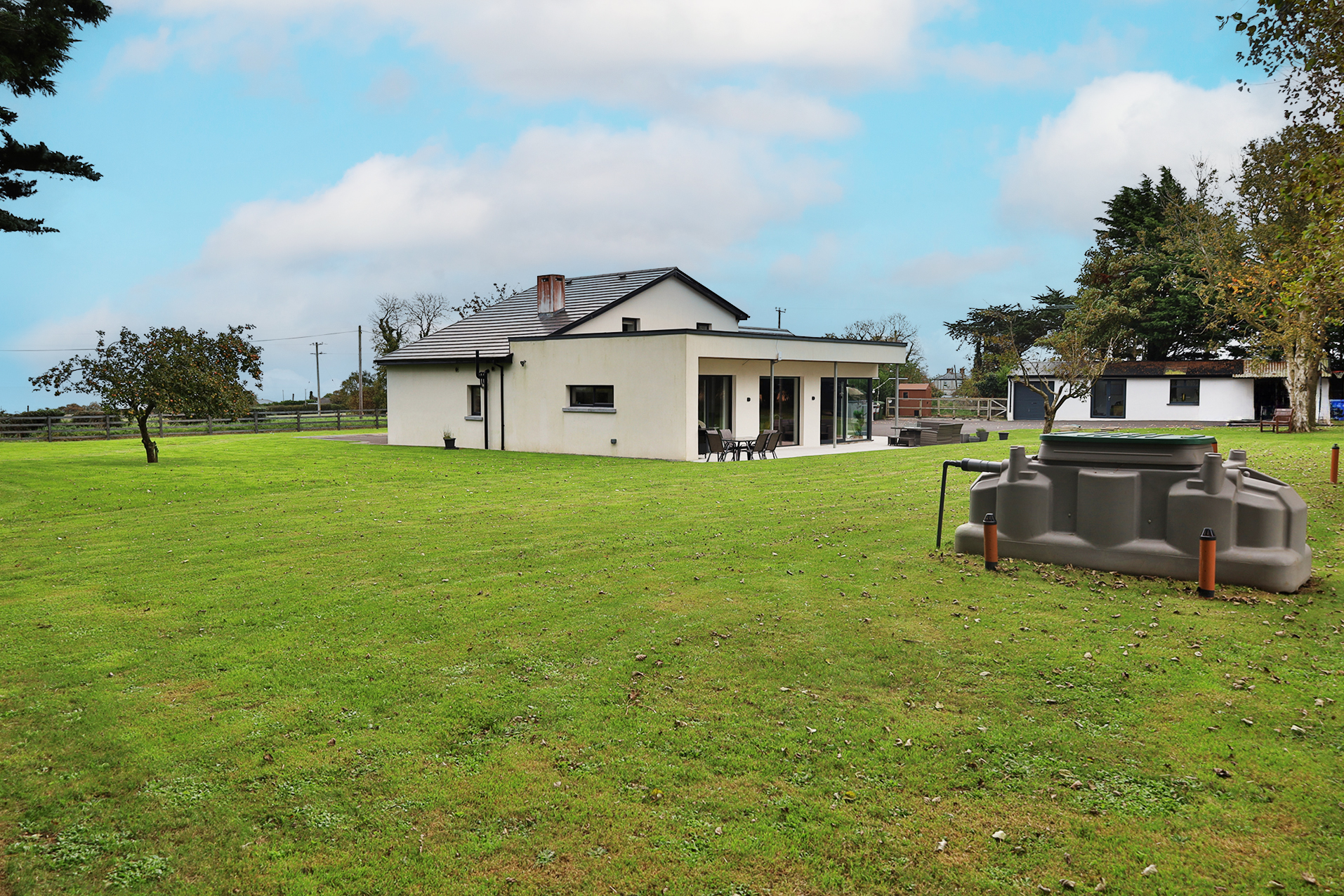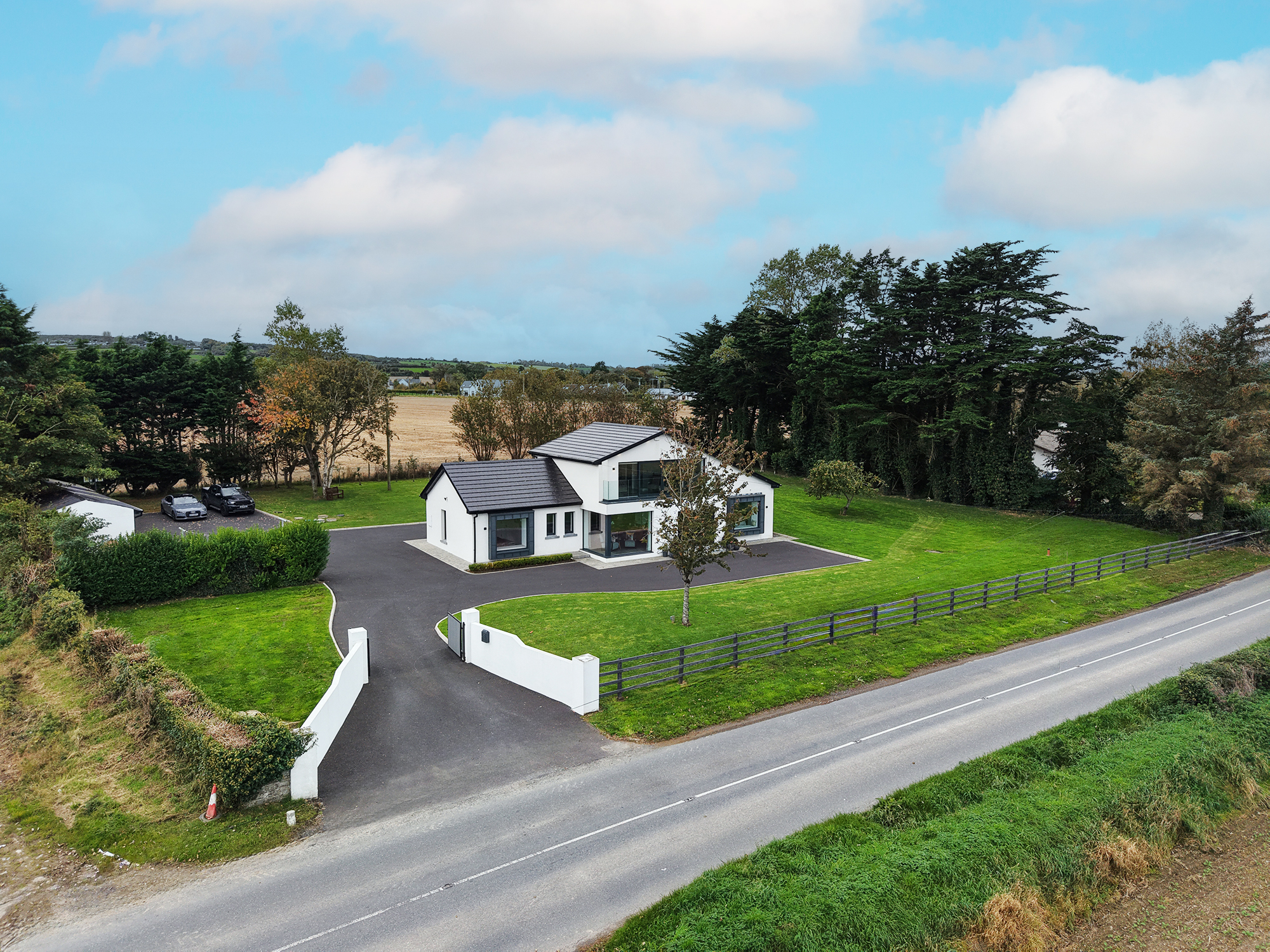 Completely rebuilt in December 2021 to exacting standards, the property boasts a contemporary rendered finish with sleek grey double-glazed PVC or aluminium framed windows and doors, striking zinc cladding, and a tiled roof. From the moment you arrive, the attention to detail is evident from the composite slatted entrance gates and tarmac driveway to the tastefully designed external lighting and manicured lawns that wrap around the home.