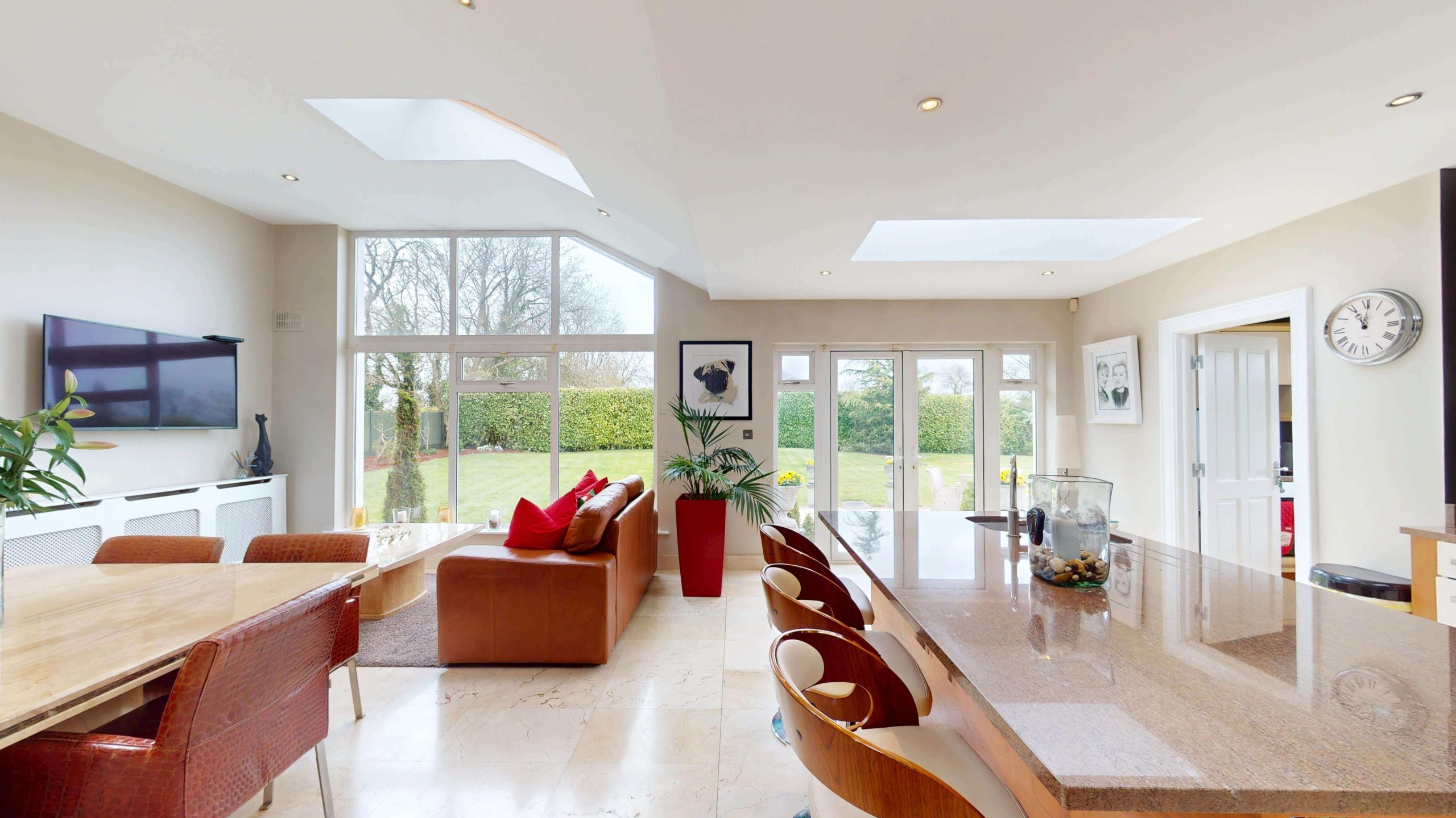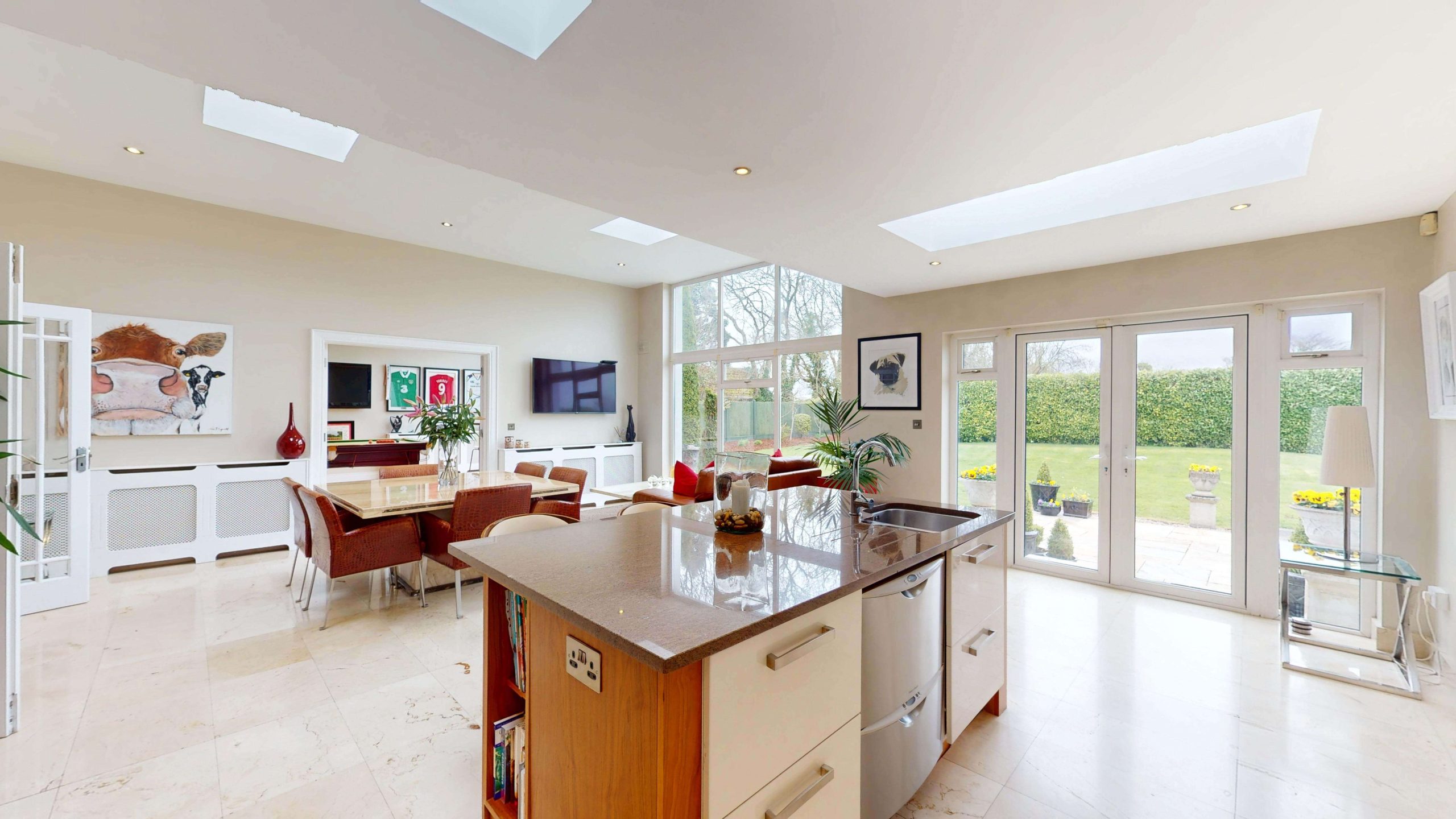 The heart of the home is a stunning open-plan kitchen, dining and living space, designed with modern family living in mind. Flooded with natural light from expansive glazing and skylights, this area seamlessly connects to the gardens and patio spaces, creating an ideal environment for both everyday life and entertaining.